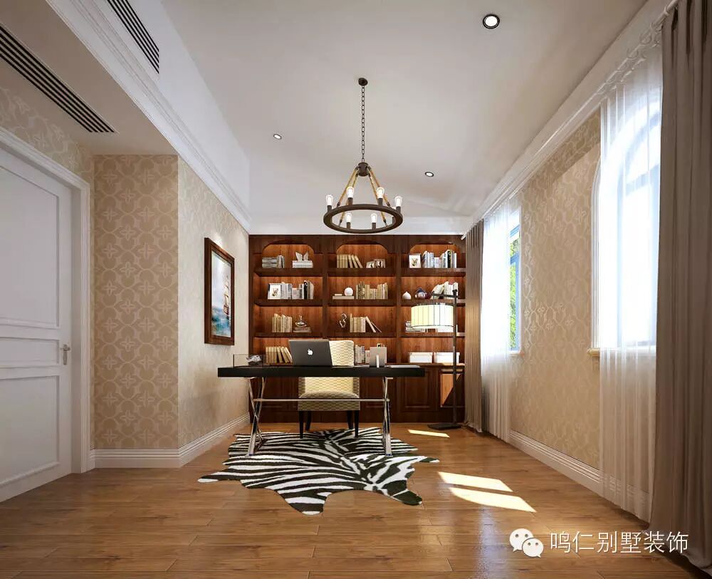 闲暇时,坐在这里放松身心,享受安静、舒适惬意的读书时光。鸣仁装饰设计师突出书房的功能性,整体以白色、米色为主,简约明亮,分明的线条,搭配深色的家具,简单中不失宁静之感。